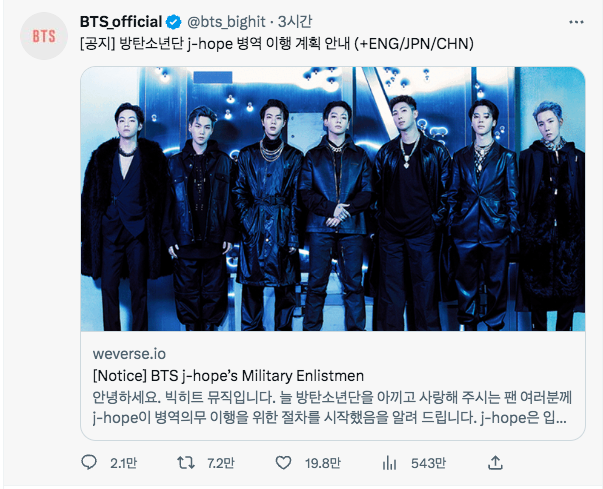 안녕하세요. 빅히트 뮤직입니다. 늘 방탄소년단을 아끼고 사랑해 주시는 팬 여러분께 j-hope이 병역의무 이행을 위한 절차를 시작했음을 알려 드립니다. j-hope은 입영 연기 취